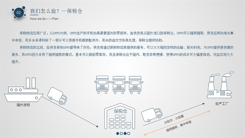 1. 保税进口:进口货物入保税物流中心,即可享受国家的保税政策,暂缓交税。 主要缓解企业税款资金压力、节省货物仓储场地、缩短货物交货周期作用。